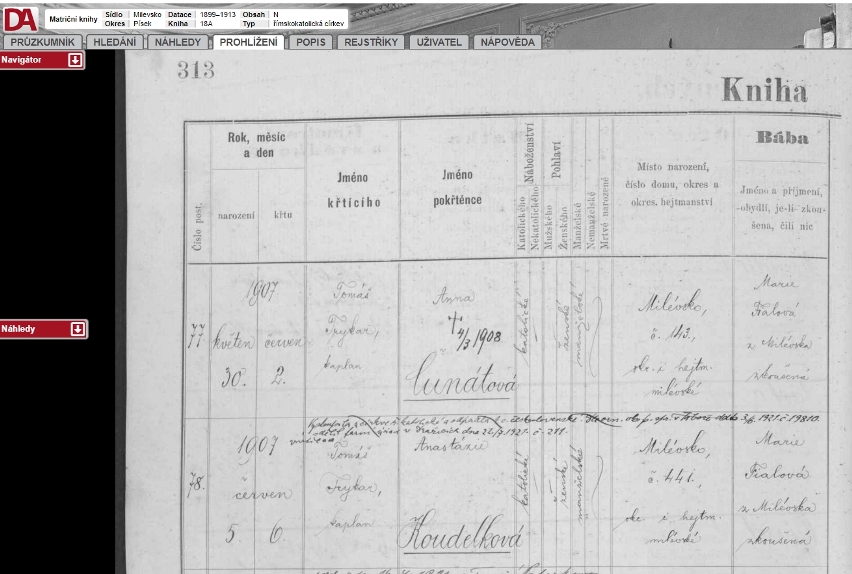 Děkuji za pomoc i rychlou reakci. Je to trochu složité. Marie žila nejprve pravděpodobně v manželství s Václavem Koudelkou. Že byli manželé usuzuji pouze z matričního záznamu prvního dítěte - Anastázie. Narodilo se jim celkem 5 dětí (Anastázie *5.6.1907 Milevsko, Marie *1910, Josefa *24.4.1915 Strkov, Božena *? a Karel *3.11.1917 Balkova Lhota), které se všechny jmenovaly Koudelka. Pak bylo manželství "asi" rozloučeno (nevím jistě). A Marie začala žít s Pejšou, ale bez sňatku. Pak se narodilo dítě, které má za otce Václava Pejšu (František Pejša *19.2.1923 Milevsko) a teprve po více než 25 let po tom se Pejša s Marií vzali (dne 20.11.1948). Řada matrik je živá a většinu údajů jsem použil z jiných zdrojů (parte, apod.). Posílám záznam matriky Milevské (Anastázie), ale bohužel nemám odkaz, pouze sken záznamu.