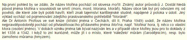 Myslel jsem si, že je to Moráň, což je bývalá obec zaniklá napuštěním slapské přehrady u obce Malčany/Čím, ale ta nepatřila do panství Karlštejnského a po Malčáncích v této obci ani vidu ani slechu