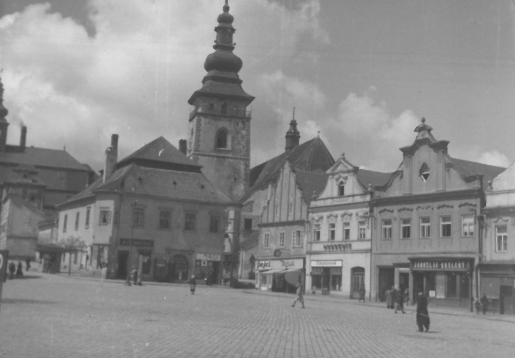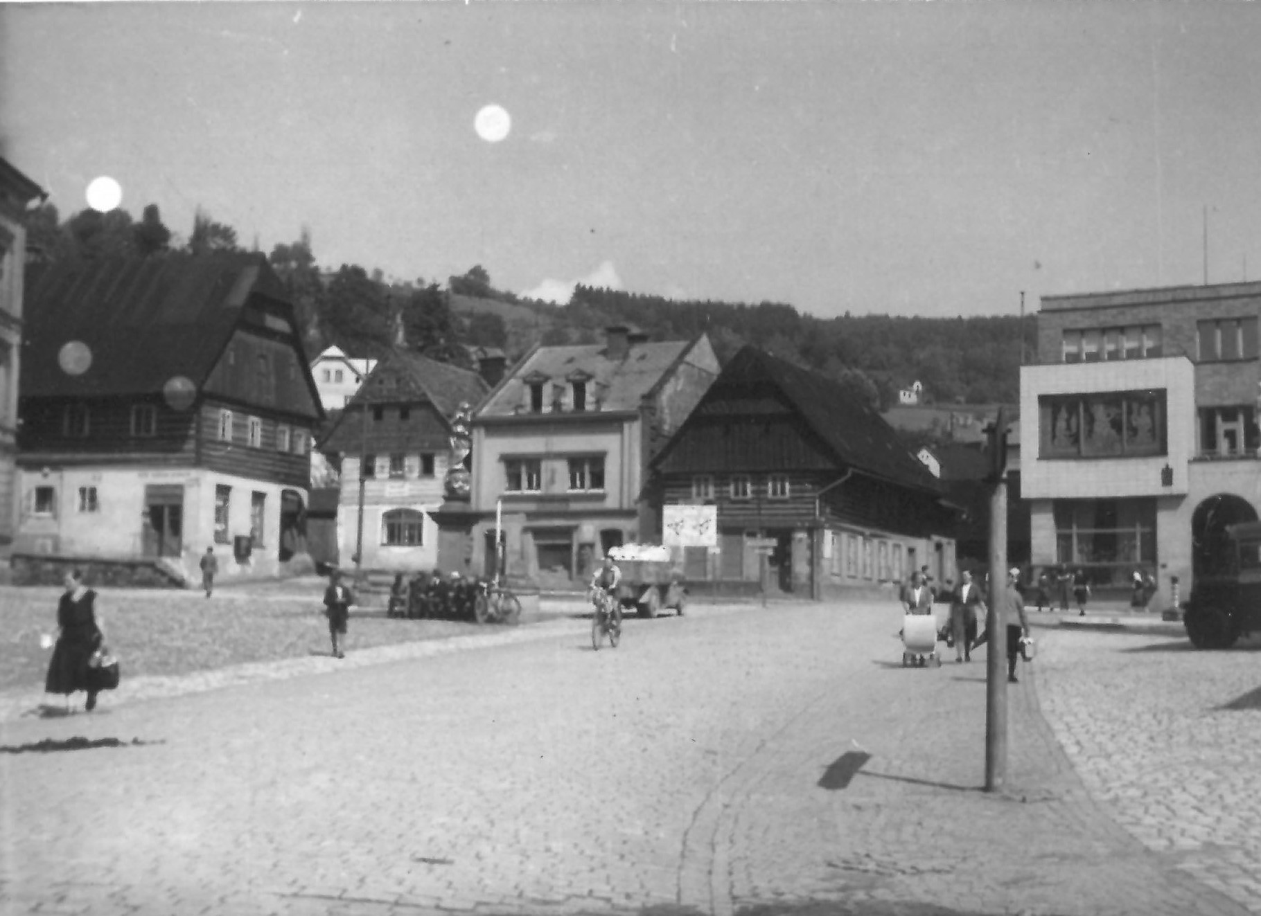 Když jsem viděl pátou fotku, tak první, co mě napadlo, bylo Vrchlabí. Ale tam jsem to nenašel. Možná by vodítkem mohla být ta funkcionalistická stavba na snímku úplně vpravo.