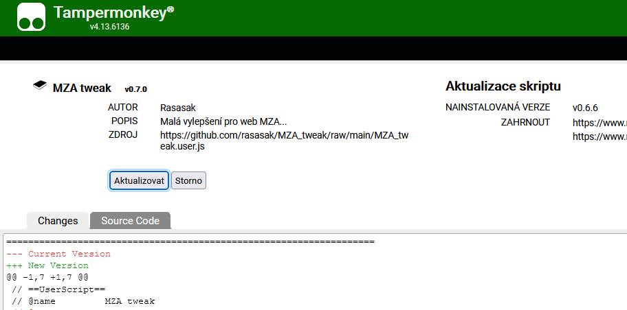 Vyskočilo vám již okno s aktualizací ? (vzhled se může lišit podle doplňku ve vašem prohlížeči - takto vypada například u tampermonkey )