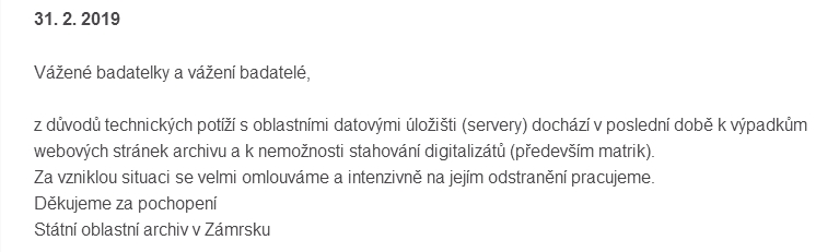Já si dovolím vyslovit domněnku, že může docházet k nahrávání matrik, které jsou volně stažitelné od 1. 1. 2019, proto jsou dočasně odpojeny stránky (před dvěma lety tomu tak v lednu bylo). Bohužel již není aktivní facebookový profil archivu, takže se nelze zeptat druhou stranou :|