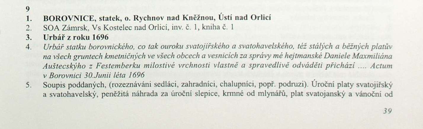 Urbář statku Borovnice z roku 1696 a