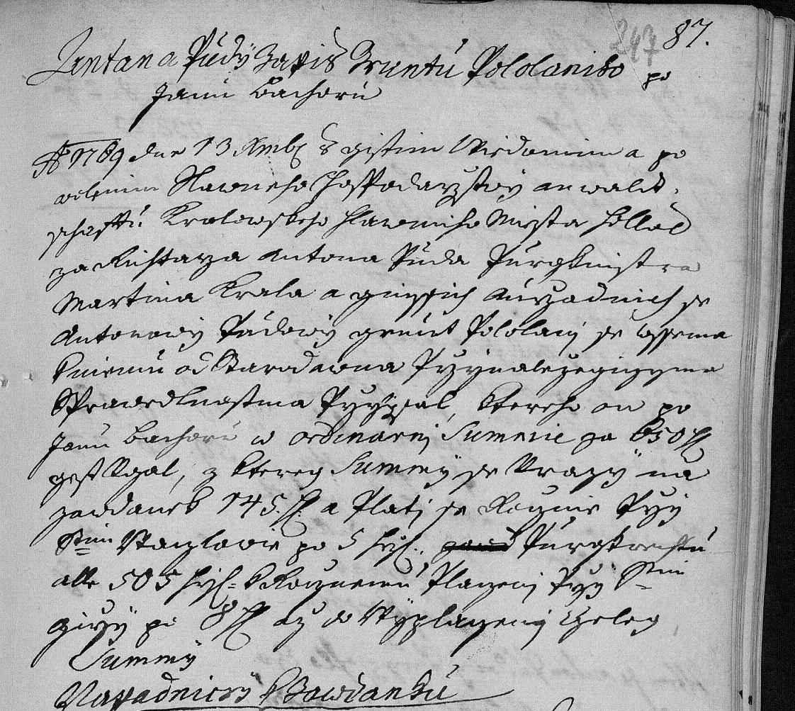 A 1789 dne 13 Xmb s jistim domim a povolenim slavného hospodarstvi Anwaldtschafftu královského hlavniho města Holloc (asi Olomouc) za Richtarze Antona Puda Purgmistra Martina Krala a jinších aurednich se Antonovy Pudovy grunt pololany se vsema k němu odstarodavna przynalezejiczyma spravedlnostma przypsal kterého on po Janu