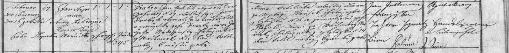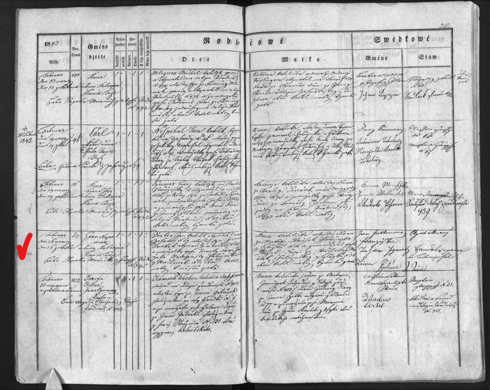 Většina toho záznamu je psána písmem, které se jmenuje kurent. Zjednodušeně řečeno je to psací podoba švabachu. Tohle písmo se budete muset naučit číst, ve starých matrikách to bez něj nepůjde. Tady máte alespoň jména napsaná naším normálním (humanistickým) písmem, ale problém nastane, až bude záznam kurentem komplet celý.