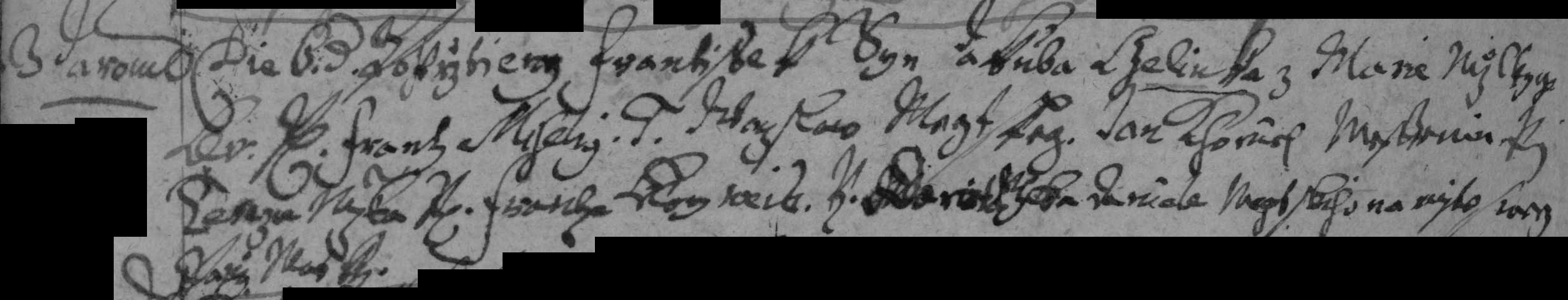 Ten text je ovšem šílený. Zkuste hledat stejná jména kmotrů v okolních zápisech. Kmotři se často opakují - např. onen Franz bych teď řekl, že se psal Mihelig - stejné jméno je v prvním zápisu na pravé straně. Za jménem Tereza bude zase zkrácenina Mžka (manželka) P. Frantze ...